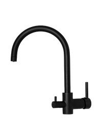 Rubinetto Nobili a Ombrello Nero con 3 vie di erogazione separata (acqua calda e fredda / acqua depurata) realizzato in ottone con finitura in nero opaco. Bocca girevole a 360°, vitone in ceramica a 90° e filtro non incluso.