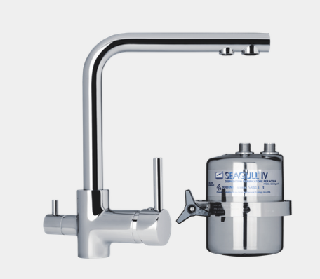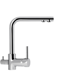 Rubinetto Nobili a Ponte con 3 vie di erogazione separata (acqua calda e fredda / acqua depurata) realizzato in ottone cromato, con bocca girevole a 360° e valvola a disco in ceramica con sistema antigoccia.