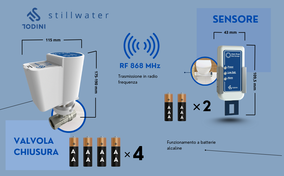 Il sistema antiallagamento Stillwater è alimentato da batterie con una durata di circa 2 anni. I tempi di risposta rapidi (massimo 40 secondi) permettono una maggiore efficienza e conservano la durata delle batterie.